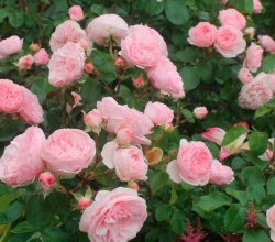 Цветки диаметром 7-8 см, мягкого нежно-розового цвета, густомахровые, ностальгические, как бы разделённые на 4 части, как у старинных английских роз. Кусты сильные, густые,Высота 70-90 см. Цветки прочные, собраны в зонтиковидные соцветия. Цветёт в течение всего лета. Глянцевая тёмно-зелёная листва образует прекрасный контраст с цветками. Листья неподвержены заболеванию мучнистой росой и чёрной пятнистостью. Благодаря крепким, хорошо ветвящимся кустам великолепно смотрится в групповых посадках, впечатляя роскошью и здоровьем. Подходит также для выращивания в контейнерах и для срезки в вазы. Большое количество цветущих побегов дугообразно свисает и придаёт этому сорту романтический флёр! Очень устойчивый и морозостойкий сорт. Аромат: лёгкий.